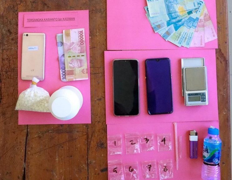 Dari tangan pekerja serabutan itu, polisi menyita 8 plastik klip masing-masing berisi sabu dengan jumlah total 2,1 gram; pipet kaca berisi sisa sabu 1,4 gram; timbangan elektrik; uang Rp 500 ribu dan 2 (dua) unit Handphone.