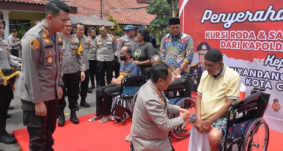 Kegiatan dilanjutkan dengan penyerahan bantuan kursi roda sebanyak 16 buah dan santunan tali asih dari Kapolda Jabar kepada penyandang disabilitas di Kota Cirebon dengan perwakilan hadir 5 orang. Tambah Kasi humas Polres Cirebon Kota Iptu Ngatidja, SH.MH.