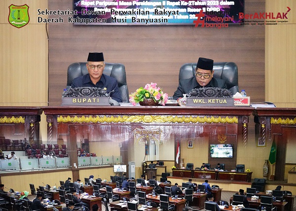 Rapat yang berlangsung di ruang rapat Paripurna tersebut dipimpin oleh Wakil Ketua I DPRD Jonkenedi, SIP., M.Si dihadiri Pj. Bupati Musi Banyuasin Drs. H. Apriyadi, M.Si, Anggota DPRD, Asisten Setda Musi Banyuasin, Plt. Sekretaris DPRD, Polres Musi Banyuasin, Dandim 0401/Muba, Perangkat Daerah Musi Banyuasin dan Pihak terkait lainnya yang hadir secara Virtual.
