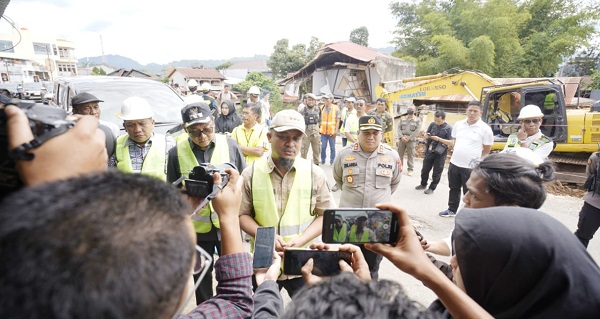 Ia didampingi Bupati dan Wakil Bupati Kabupaten Toraja Utara, Yohanis Bassang dan Frederik Victor Palimbong melihat langsung pembangunan jembatan yang sedang tahap penggalian bahan pondasi.