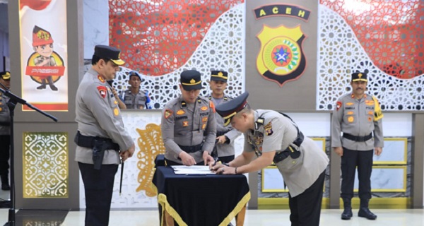 Kapolda Aceh memimpin upacara Sertijab tersebut di Lobby Mapolda Aceh, Rabu, (12/7/2023), kata Kabid Humas Polda Aceh Kombes Pol. Joko Krisdiyanto, S. I. K, dalam siaran persnya.