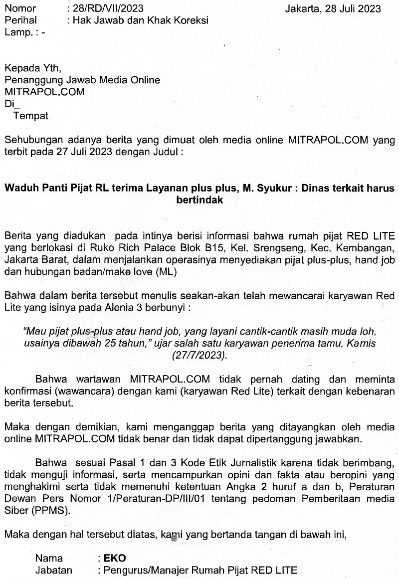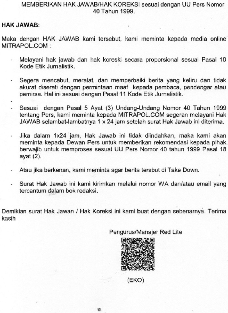 Terkait pemberitaan diatas kami redaksi telah menerima hak jawab dari pihak RL pada tanggal 29 Juli 2023 dan sesuai dengan UU Pers Nomor 40 Tahun 1999 bersama dengan ini kami lampirkan hak jawabnya.