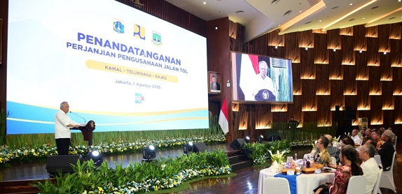 MITRAPOL.com, Jakarta – Menteri Pekerjaan Umum dan Perumahan Rakyat (PUPR) didampingi Pj Gubernur Banten Al Muktabar dan Direktur Utama PT Duta Graha Karya Nono Sampono menyaksikan Penandatanganan Perjanjian Pengusahaan Jalan Tol (PPJT) Kamal-Teluknaga-Rajeg (38,60 km) di Kantor Kementerian PUPR, Selasa (1/8/2023).