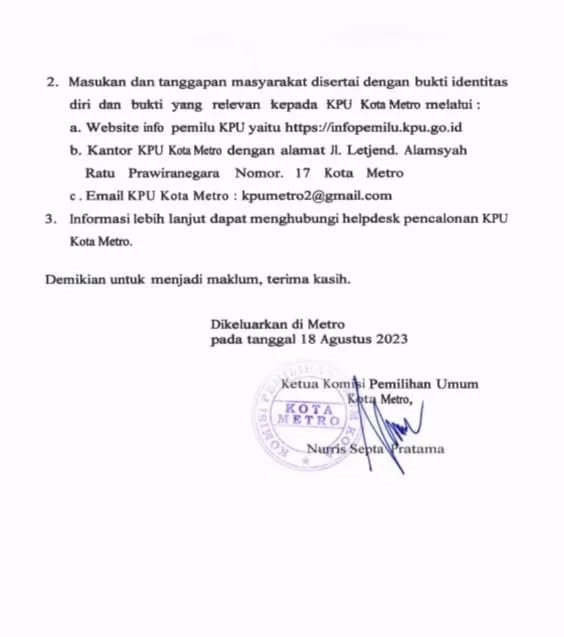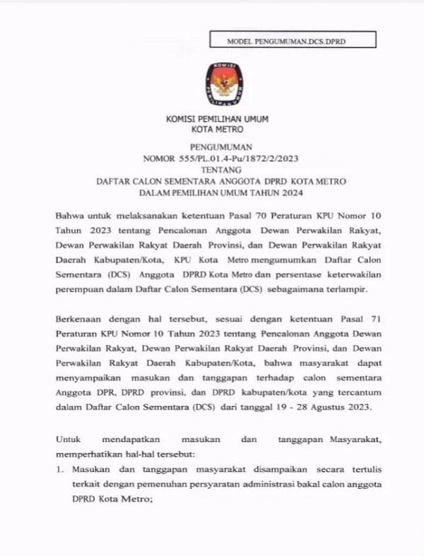 Hal ini dituangkan dalam surat resmi KPU Kota Metro yang ditanda-tangani oleh Ketua KPU Kota Metro, Nurris Septa Pratama. Dalam surat resmi tersebut dinyatakan bahwa pengumuman calon peserta DPRD Kota Surabaya dilakukan untuk melaksanakan ketentuan Pasal 70 Peraturan KPU Nomor 10 Tahun 2023 tentang Pencalonan Anggota Dewan Perwakilan Rakyat, Dewan Perwakilan Rakyat Daerah Provinsi, dan Dewan Perwakilan Rakyat Daerah Kabupaten/Kota, KPU Kota Metro mengumumkan Daftar Calon Sementara (DCS) Anggota DPRD Kota Metro dan persentase keterwakilan perempuan dalam Daftar Calon Sementara (DCS) sebagaimana terlampir.