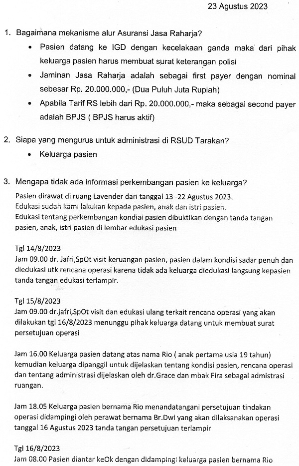 Terkait pemberitaan diatas kami redaksi telah menerima hak jawab dari pihak RSUD Tarakan pada tanggal 23 Agustus 2023 dan sesuai dengan UU Pers Nomor 40 Tahun 1999 bersama dengan ini kami lampirkan hak jawabnya.