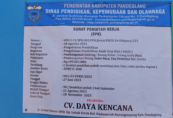 MITRAPOL.com, Pandeglang – Pemerintah kabupaten Pandeglang melalui Dinas Pendidikan Kepemudaan dan Olah Raga mengucurkan anggaran sebesar Rp. 199.500.000 (Seratus Sembilan Puluh Sembilan Juta Lima Ratus Ribu Rupiah) untuk pembangunan satu ruangan guru untuk TK Negeri Pembina Carita. Dengan Surat Perintah Kerja (SPK) 400.3.13./SPK.002.PPK.Konst.PAUD.34-Dikpora/223.dengan pelaksana CV. DAYA KENCANA.