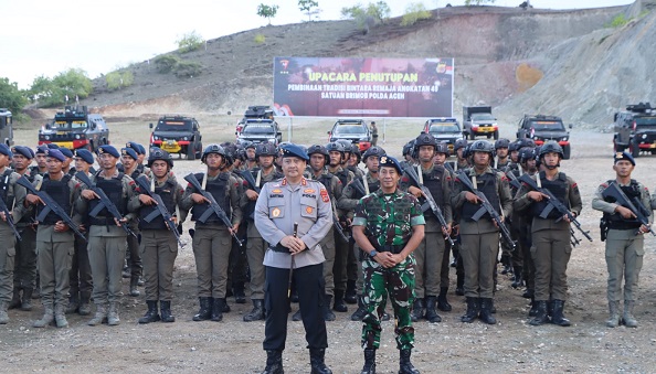 MITRAPOL.com, Jantho — Kapolda Aceh Irjen Achmad Kartiko dan Pangdam IM Mayjen Novi Helmy Prasetya menghadiri penutupan pembinaan tradisi personel bintara remaja Brimob tahun anggaran 2023 di Puslat Brimobda Aceh, Lamreh, Kabupaten Aceh Besar, Rabu, 11 Oktober 2023.