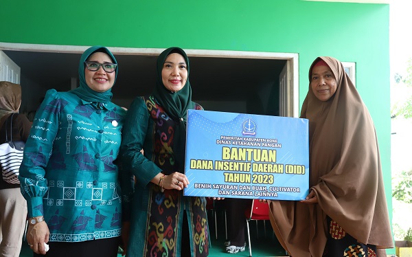 Dalam kesempatan ini, Sofha Marwah menyerahkan Bantuan Dana Insentif Daerah (DID) 2023, benih sayuran dan buah, cultivator, dan sarana lainnya kepada KWT Annisa Ghopny, Binaan Ketahanan Pangan Bone Program P2L dan Inovasi Puspa Harapan.