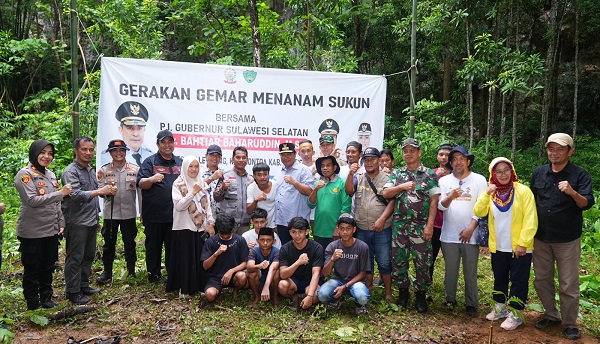 Penjabat Gubernur Sulsel, Bahtiar Baharuddin, memulai penanaman pohon sukun di Rammang-rammang, Minggu, 17 Desember 2023. Ia didampingi Bupati Maros AS Chaidir Syam, serta jajaran Forkopimda Kabupaten Maros.