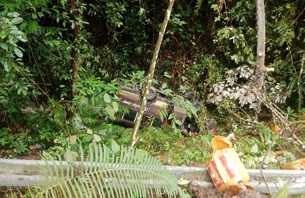 Tepat di TKP posisi jalan lurus dan menurun, mobil melaju tidak terkontrol lalu terjun kejurang sedalam 30 meter sebelah kiri searah tujuanya.