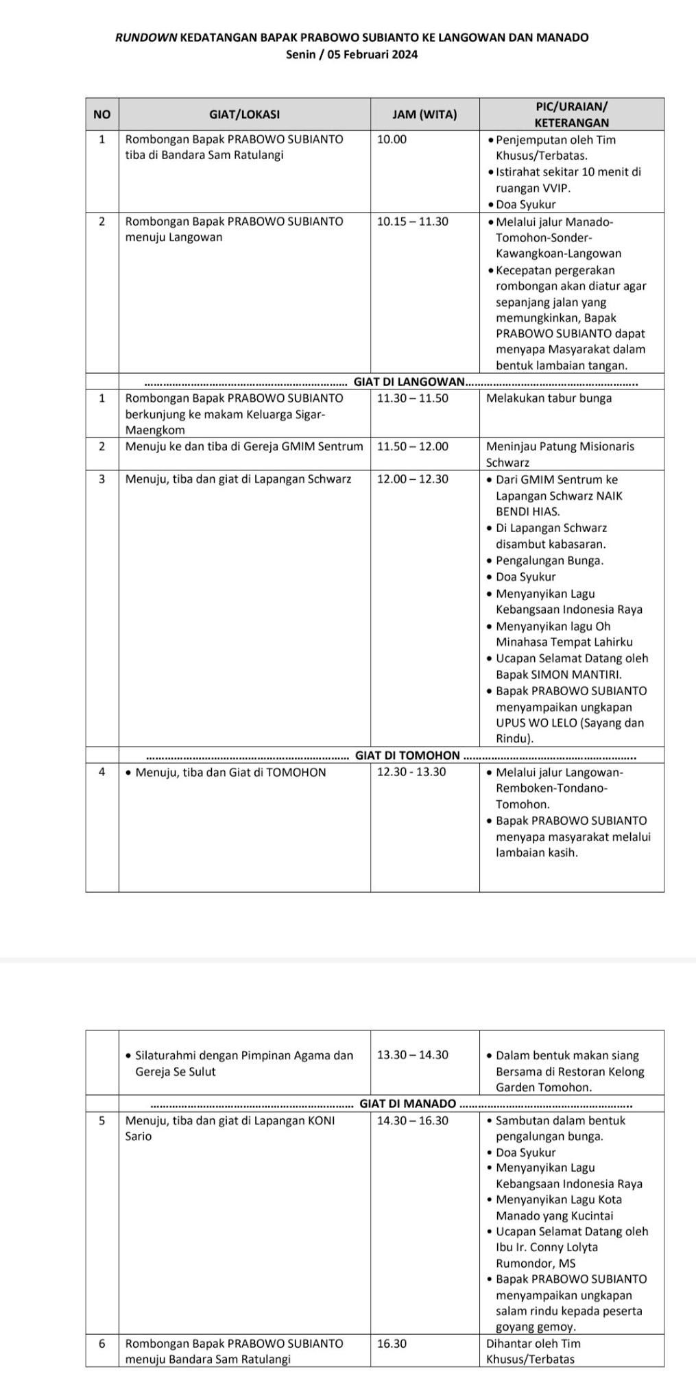 “Sekarang ini sementara persiapan debat. Benar, bapak Prabowo Subianto besok ke Manado. Jadwalnya di Langowan jam 9 pagi. Tim Hambalang sudah mendahului beliau ke sana,” jelas Andrew Soebali.