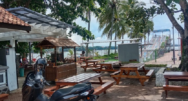 Tersedia kafe juga yah , bisa sambil menunggu anak bermain perosotan dan kita bisa duduk santai menikmati angin pantai dan makanan yang tersedia di kafe. Lanjutnya.
