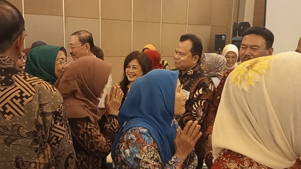 Ronny F. Sompie didampingi Istri Ny Dyah Iswarini disambut para peserta paguyuban PENSI, tak sedikit melakukan swafoto serta mengobrol dengan akrab.