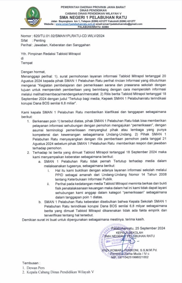 Terkait pemberitaan di atas, redaksi telah mendapat hak jawab dari pihak SMA N 1 Pelabuhan Ratu pada hari Kamis, tanggal, 26 September 2024, dimana surat tersebut di tandatangani oleh Kepala Sekolah SMAN 1 Pelabuhan Ratu Hadi Komar Purkoni S.S,M.M.Pd.