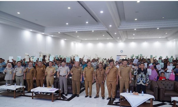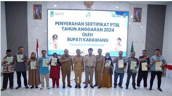MITRAPOL.com, Karawang Jabar – Kepala BPN Karawang, H. Nurus Sholichin, A.Ptnh, MM menghadiri penyerahan sertifikat PTSL Tahun Anggaran 2024 yang secara simbolis diserahkan kepada sepuluh orang dari sepuluh Desa oleh Bupati Karawang, H. Aep Syaepuloh, SE di Aula Husni Hamid Pemda Karawang, Senin (23/9/24).