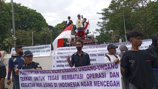 Aksi yang diikuti oleh lebih dari 50 orang ini menolak dugaan campur tangan organisasi non-pemerintah (NGO) asal Amerika Serikat dalam Proyek Strategis Nasional (PSN) dan urusan Papua di Indonesia.