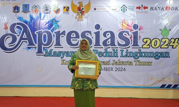 Penghargaan diserahkan langsung oleh Pelaksana Tugas (Plt.) Wali Kota Jakarta Timur, Iin Mutmainnah bersama Kepala Suku Dinas Lingkungan Hidup, Eko Gumelar Susanto, kepada Kepala SMPN 213 Jakarta, Sugiyarti pada acara Apresiasi Masyarakat Peduli Lingkungan Tahun 2024 di kantor Wali Kota, Selasa (17/12/2024) lalu.