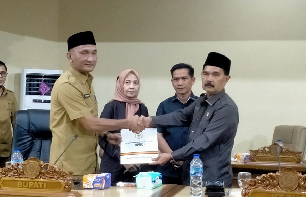 Usai pembacaan laporan Pansus DPRD Sarolangun yang disampaikan Hj Fatimah, Ketua DPRD Sarolangun Ahmad Jani menyerahkan rekomendasi DPRD terhadap LKPJ Bupati Sarolangun tahun 2024 kepada Bupati Sarolangun.