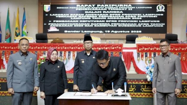 MITRAPOL.com, Lampung – Gubernur Lampung Rahmat Mirzani Djausal menghadiri Rapat Paripurna DPRD Provinsi Lampung yang menetapkan Program Pembentukan Peraturan Daerah (Propemperda) Tahun 2026, di Ruang Sidang DPRD, Selasa (19/8/2025).